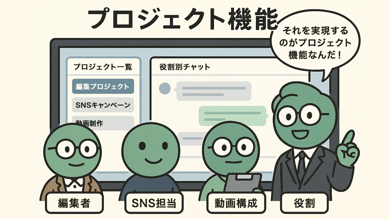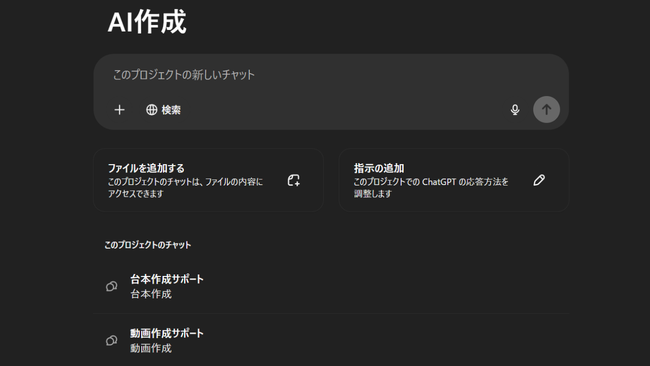 たとえば、「これは動画構成用」「こちらは記事作成用」といったように使い分ければ、 ChatGPTが“プロジェクト専任のチームメンバー”のように働いてくれる感覚になります。