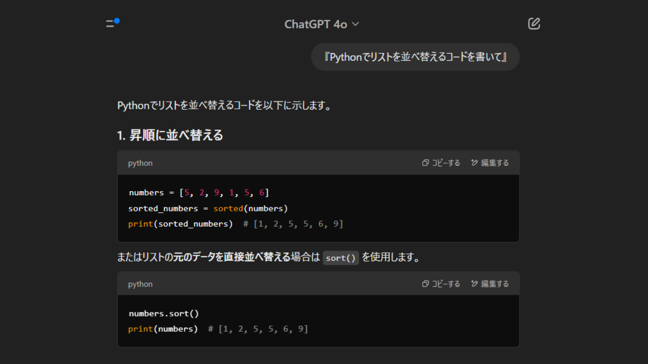 「Pythonでリストを並べ替えるコードを書いて」と入力するだけで、 即コードを生成。