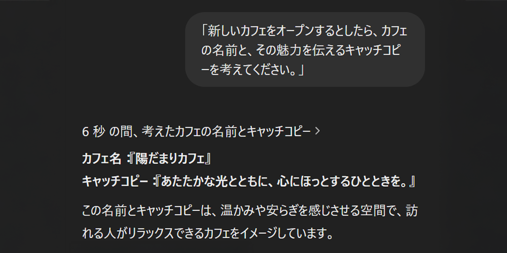 たとえば、カフェをオープンする際の店名やコンセプトの提案を依頼すると、ターゲット層や雰囲気に合わせた名前やキャッチコピーを提案してくれます。