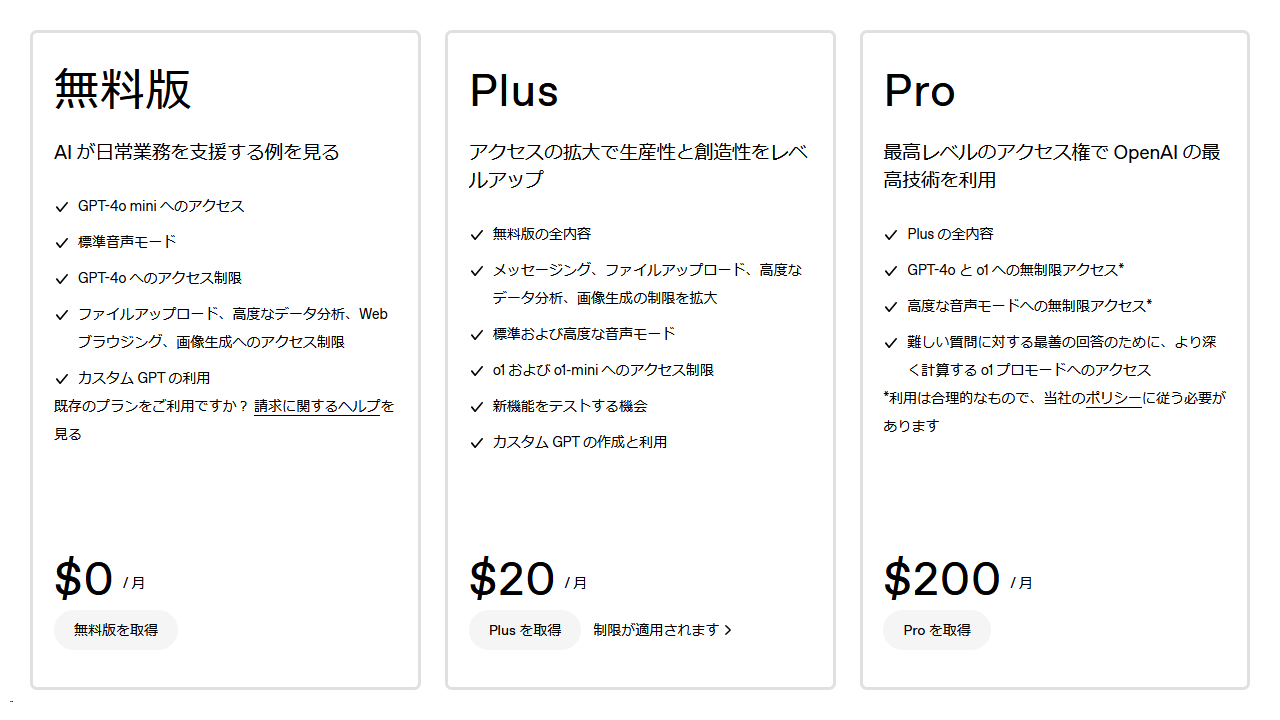 より高度な機能が必要な場合は「ChatGPT Plus」(月額20ドル)や企業向けのプランも用意されています。